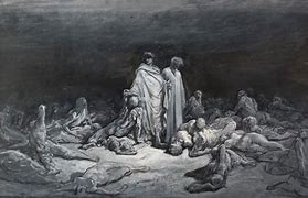 Cerberus, a doglike beast with three heads, guards the third circle of Hell and mauls the spirits punished here for their gluttony. The shades, writhing in muck, are unrelentingly pounded by a cold and filthy mixture of rain, sleet, and snow that makes the earth stink. One glutton, nicknamed Ciacco, rises up and recognizes Dante as a fellow Florentine. Ciacco prophesies bloody fighting between Florence’s two political factions that will result first in the supremacy of one party (white Guelphs) and then, less than three years later, the victory and harsh retribution of the other party (black Guelphs). After informing Dante that several leading Florentines are punished below in other circles of Hell, Ciacco falls back to the ground, not to rise again until the Last Judgment at the end of time.